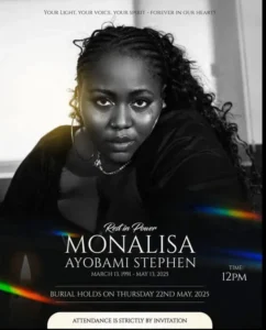 “We lay our beloved Monalisa Ayobami Stephen to rest this Thursday, May 22nd, 2025.In honor of her wishes and the family’s, this will be a private ceremony. We ask for continued prayers and respect for her memory during this time. Forever in our hearts.”